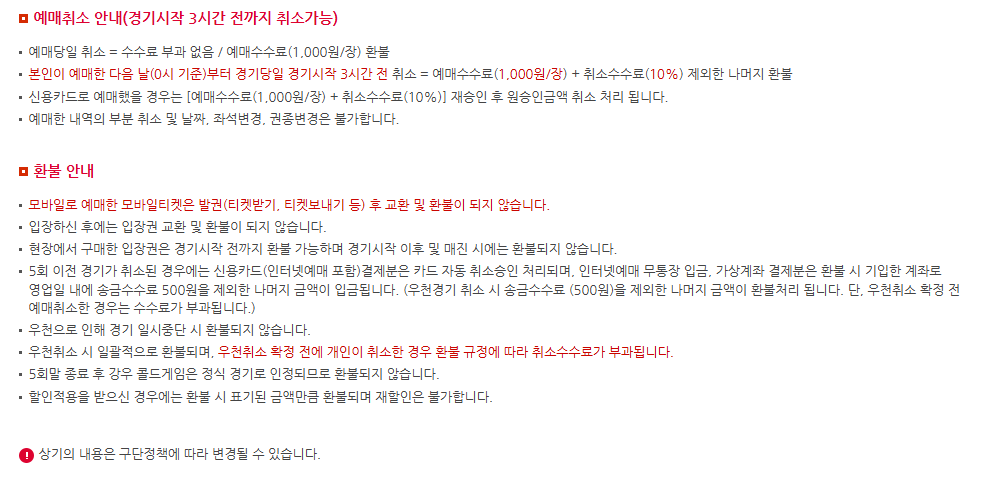 - 현장 판매: 주중 경기 1시간 전 / 주말 경기 2시간 전