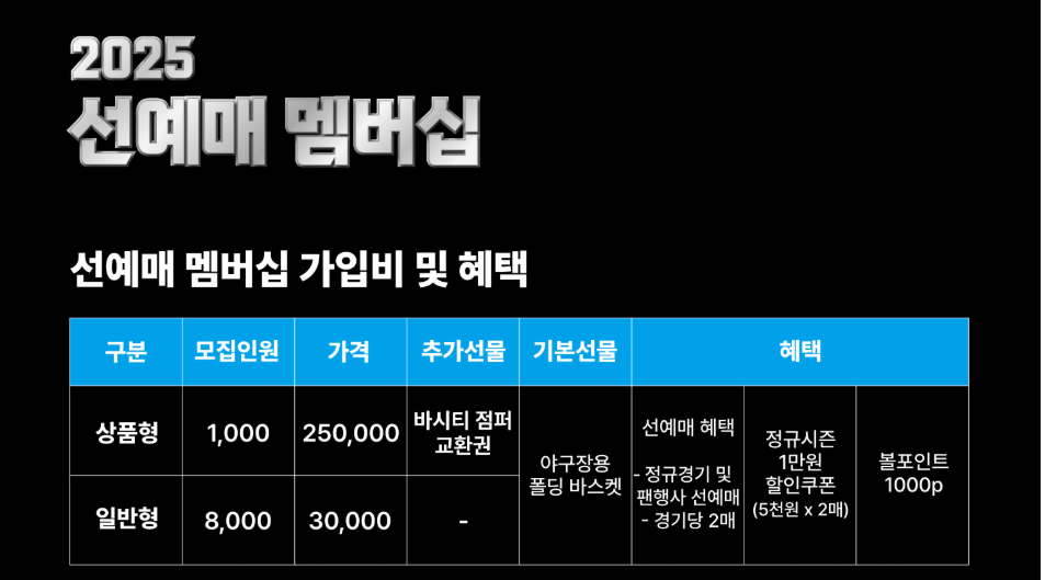 | 상품형 | 1,000명 | 250,000원 | 야구장용 폴딩 바스켓 | - 정규경기 및 팬행사 선예매 (경기당 2매) - 바시티 점퍼 교환권 - 1만원 할인쿠폰(5천원 x 2장) - 볼포인트 1,000p |