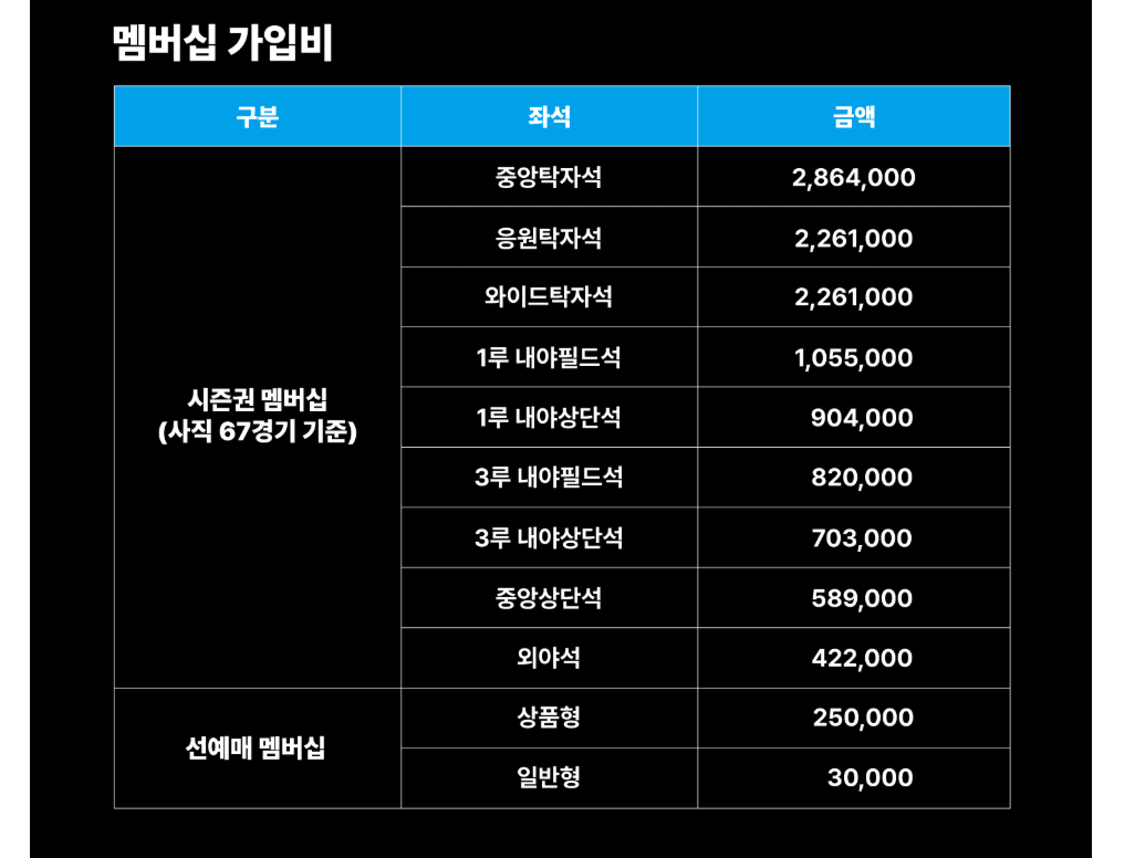 - 시즌권 멤버십: 지정 좌석을 67경기 동안 모두 예매한 형태로, 자리 보장이 필요할 경우 선택 (금액 42만~286만 원)